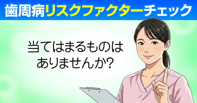 歯周病は、お口の中の環境や生活習慣によってなりやすさや進みやすさに差が出る病気です。だからこそ、「今の自分はどんなリスクを抱えているか」を知ることが、予防の第一歩になります。